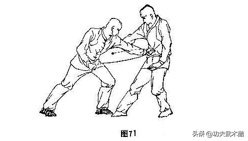 ②紧接着甲右手回收,左手再用正拳从右手下出手击打乙的关元穴(图71)。
