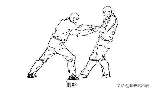 ①甲上右脚用右拳击点乙左商曲穴(图83)。