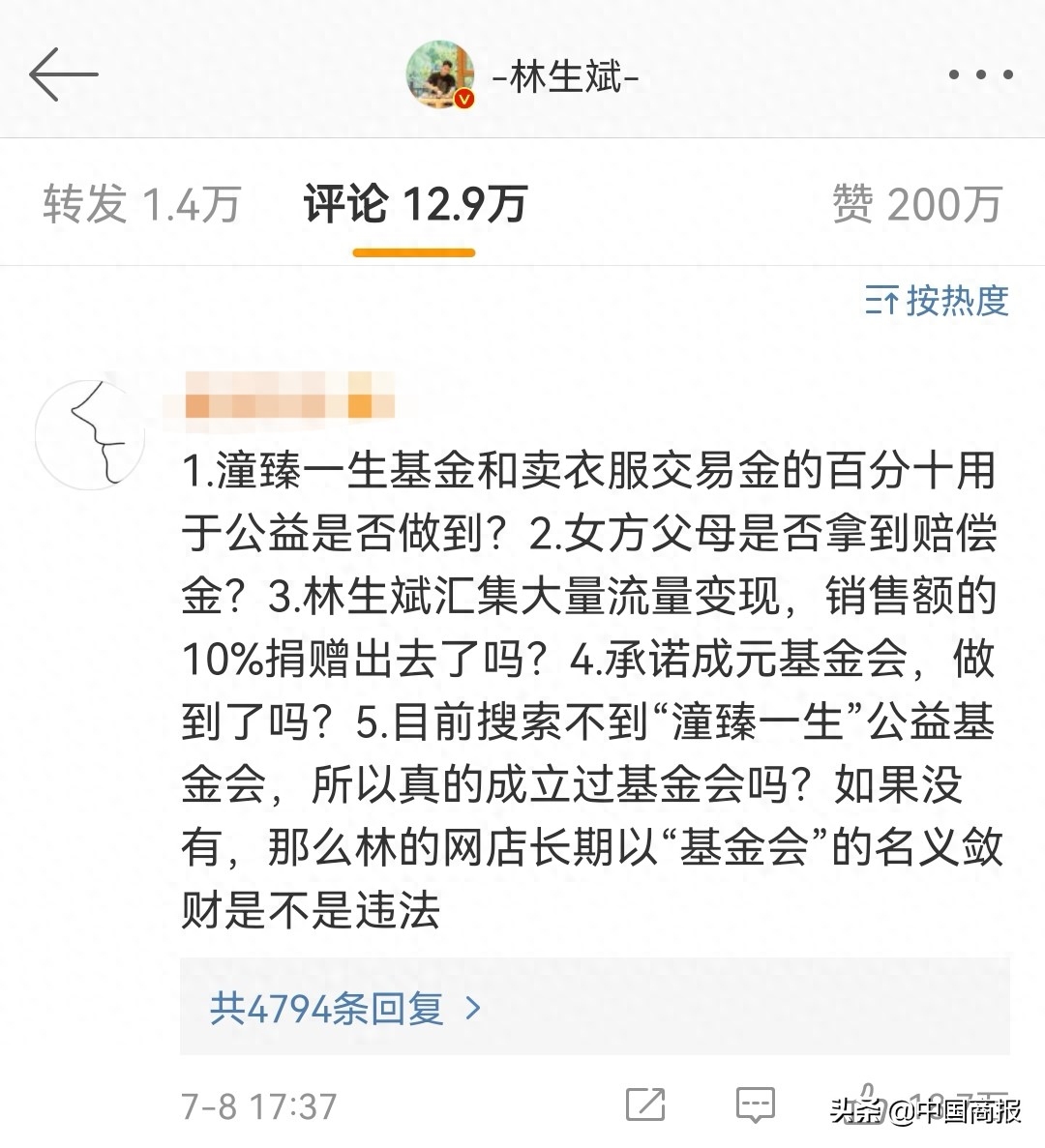 还有网友表示,林生斌连发的五条微博,也并未正面回应之前承诺要设立“潼臻一生”基金会的事。