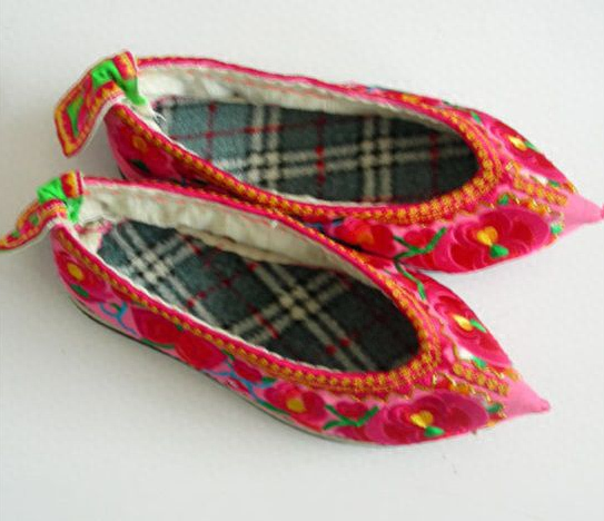 少数民族妇女在绣花鞋后面,用布巧做鞋曳,上面绣花精心点缀。既美观又有挡灰挡泥的实用价值。
