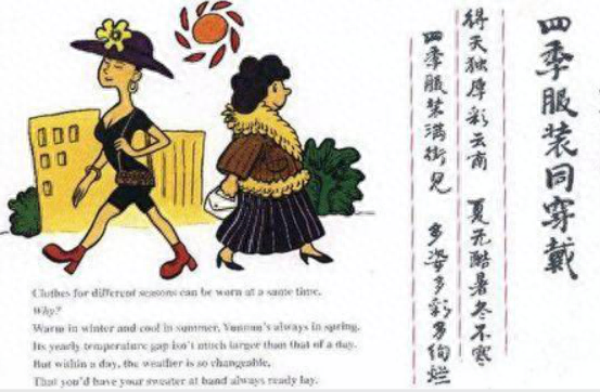 云南地区气候多变,夏天不热、冬天不寒,白天和晚上的温差较大,可以说是冷热瞬变,在街上四季服饰随处可见,长的、短的、厚的、薄的,颜色艳丽,绚丽多彩。