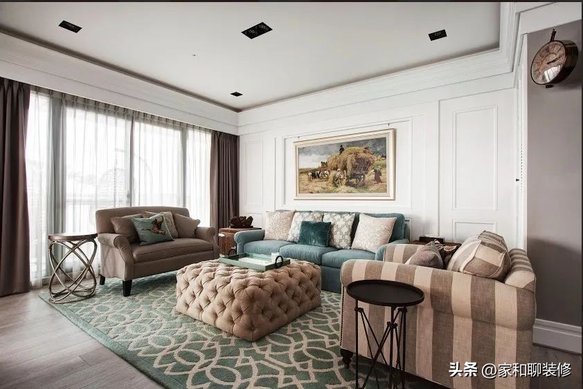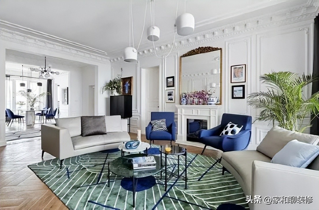 法式风格有用独特的浪漫优雅的氛围,充满艺术气息,常用石膏线、石膏角花、石膏灯盘、丝绒等材质,常用配色有米色、灰色、原木、蓝色、绿色、棕色等,搭配壁炉、线条设计来提升空间高挑感。