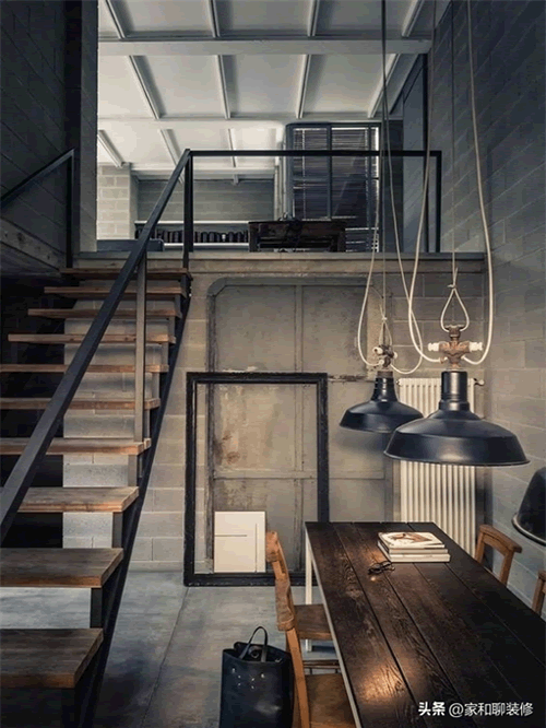 工业风如其名,风格带有原始的粗犷之美,常利用水泥、钢管、红砖等材质来装饰,配色多为黑、灰、红、棕等,将管线和材质裸露出来表达一种野性美。