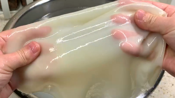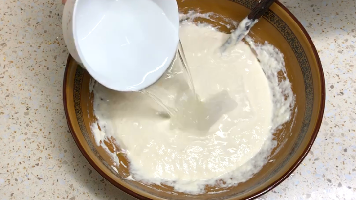 第二步:醒发好以后,再一次加入200克纯净水,用筷子不停搅拌,直至搅到没有颗粒为止。很多人都是一次搅拌好再醒发,这样容易导致面糊中有细颗粒,做出来的凉皮不光滑,所以需要先醒发后再加水拌匀,就能避免这个问题了。