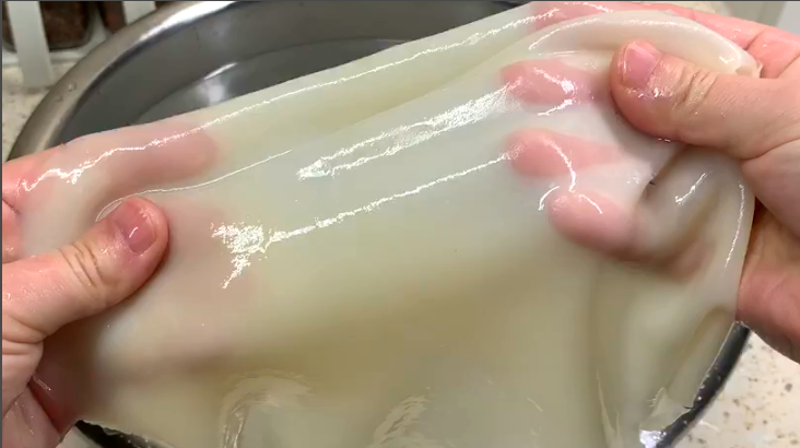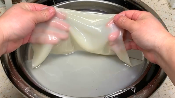 第五步:然后轻轻把凉皮拿出来放入盘中,一张凉皮就大功告成了,每做好一张表面都要刷一层食用油,可以防止凉皮干裂,保持弹性。好的凉皮呈透明状,能很清楚的看到手指,如果看不清手指就是做的过厚了。