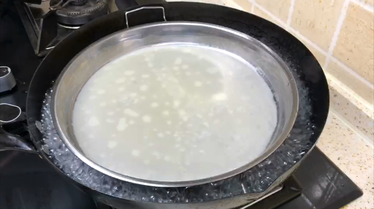 第四步:锅内加满水,大火烧开,同时准备一个大盆装适量凉水,水开后把凉皮锣锣放入锅中,中火蒸2分钟,像这样面糊凝固,表面冒出气泡就是熟了,取出放入凉水中过凉。
