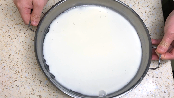 第三步:取一个凉皮锣锣(没有的就找一个浅的圆盘代替),不用刷油,舀入一勺面糊,轻轻摇晃均匀,只要薄薄的一层摊均匀就可以,不要加太多,否则面皮过厚,就吃不出Q弹爽滑感了,很多人就是因为做的过厚导致失败的。