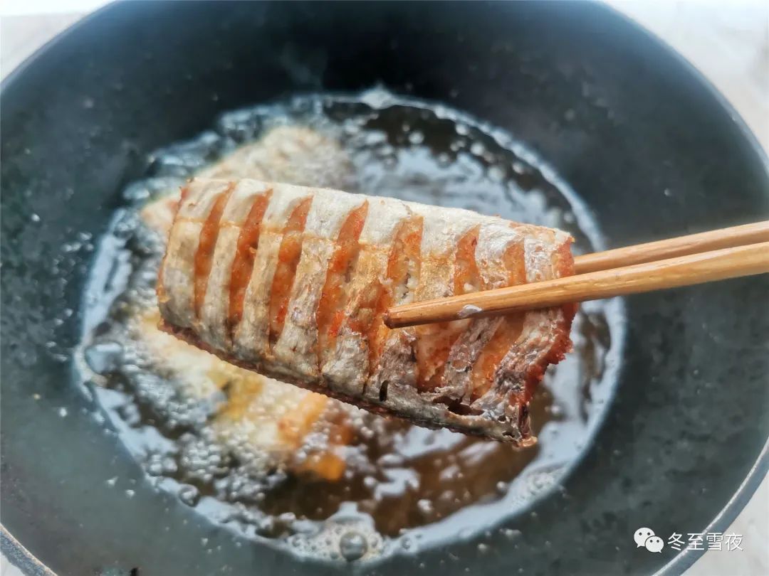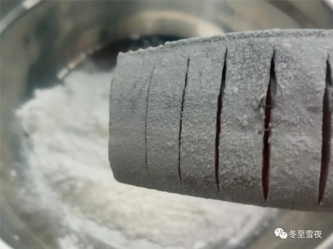 二.带鱼段裹上一层薄面粉后,炸制后,烧制出的带鱼段不碎。