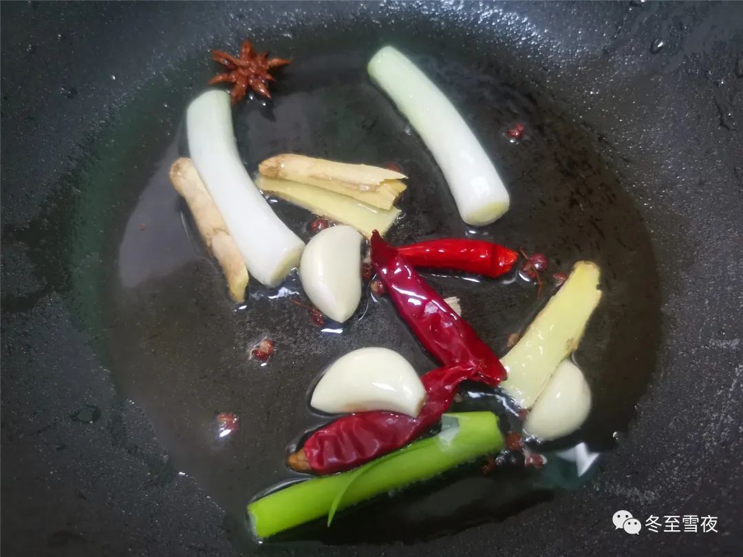 6.锅内炸带鱼的油倒出,加入少许新油,下入葱段,姜片,蒜粒,花椒,大料,干辣椒,炒出调料的香味。