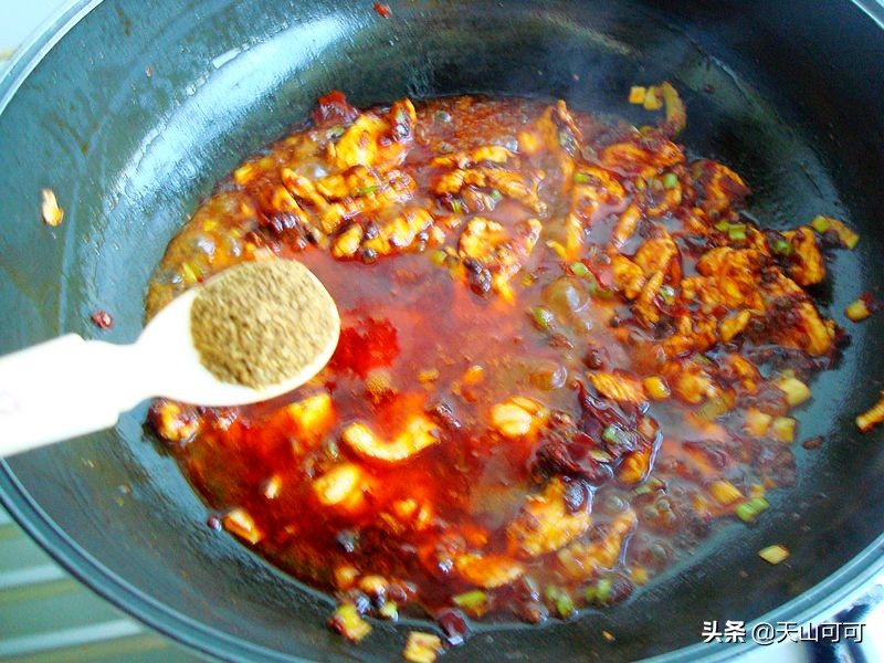 6、加五香粉和花椒粉翻炒均匀以后,加味精或者鸡精翻炒均匀