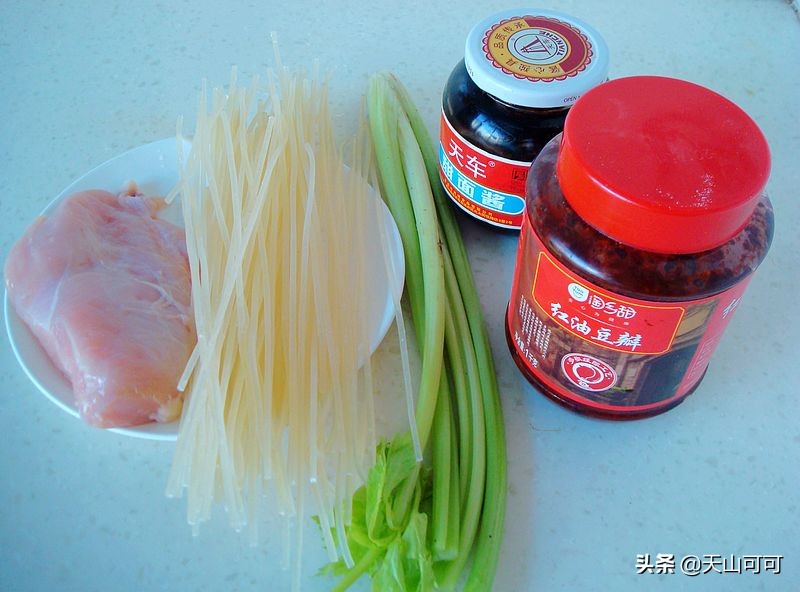 主料:芹菜一颗、鸡肉一块、干米粉400克辅料:植物油、甜面酱、豆瓣酱、生抽、大葱、姜、花椒粉、鸡精、香醋、五香粉、辣皮子