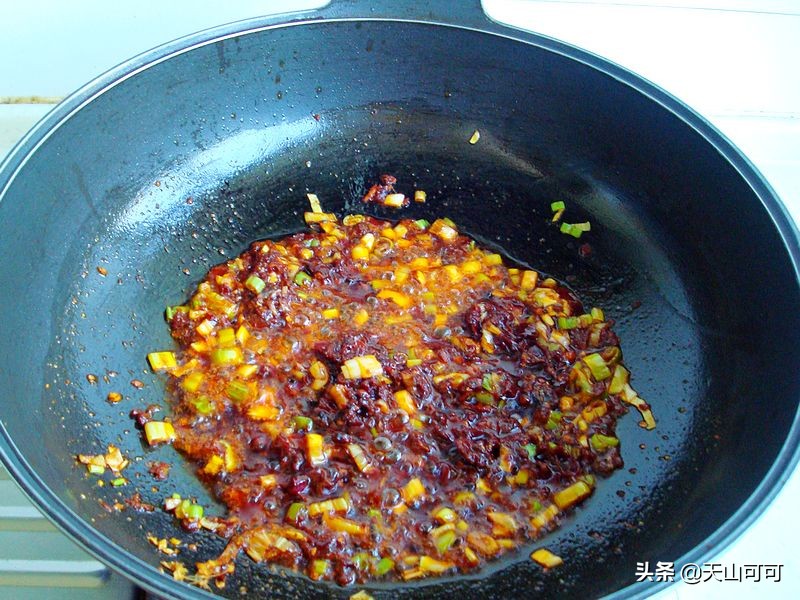 3、热锅凉油,油热8成,下葱姜炒出香味,下辣皮子末,爆炒出香辣味以后,(如果特别爱吃辣的可以加粗辣椒粉或者新疆辣皮子末翻炒红油)下豆瓣酱和甜面酱翻炒出红油,出酱香味以后
