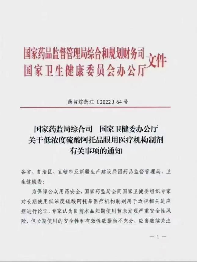 今年6月,网络上还流传着一份显示为国家药监局综合司、国家卫健委办公厅联合发布的《关于低浓度硫酸阿托品眼用医疗机构制剂有关事宜的通知》截图,图中显示,为保障公众用药安全,国家药监局会同国家卫健委组织专家对长期使用低浓度阿托品医疗机构制剂用于近视相关适应症进行论证,专家认为,目前本品短期使用暂未发现严重安全性风险,但长期使用的安全性和有效性数据尚不充分,应当继续关注。