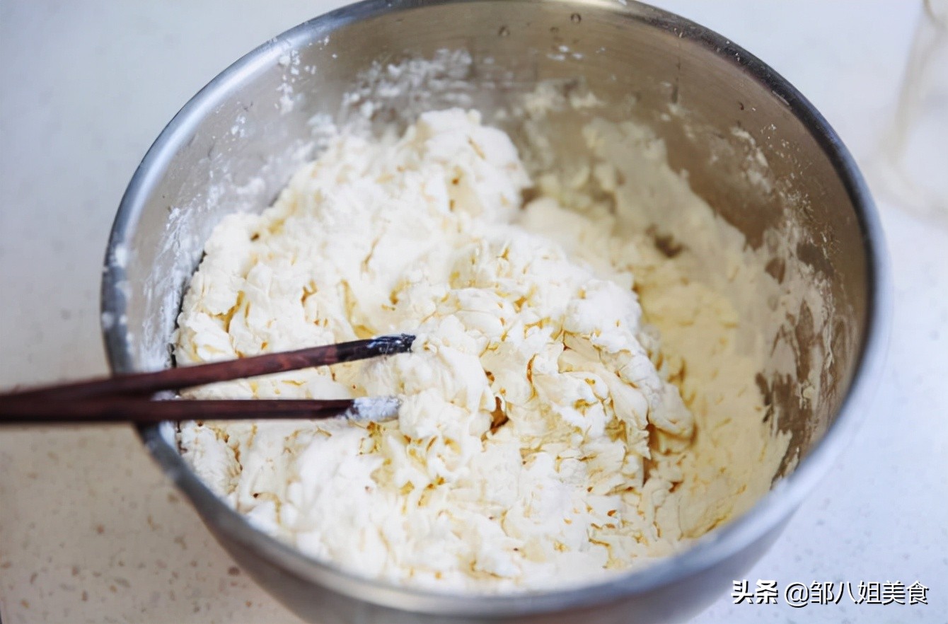 搅拌均匀,接一碗凉水,一边倒一边慢慢搅拌,或者一次少加点水,搅拌成絮后再加水,直到出现柔软的大面絮即可。