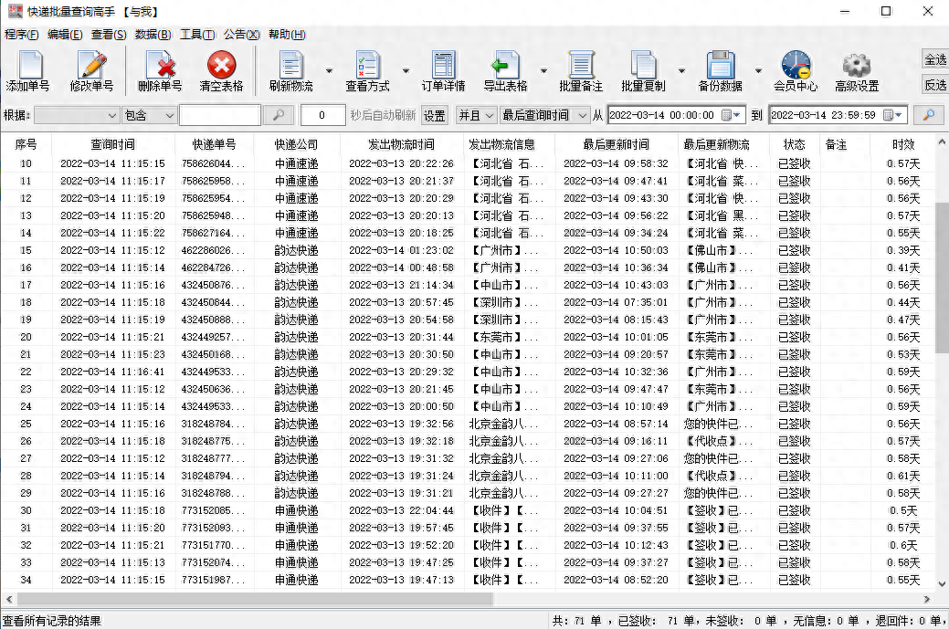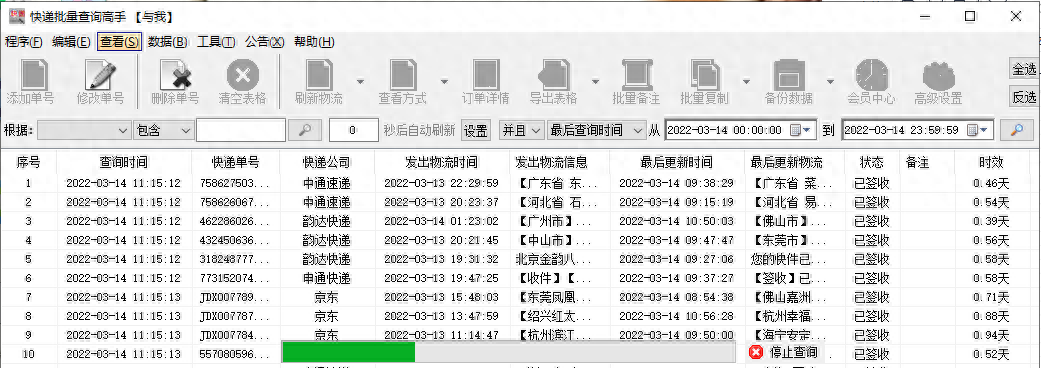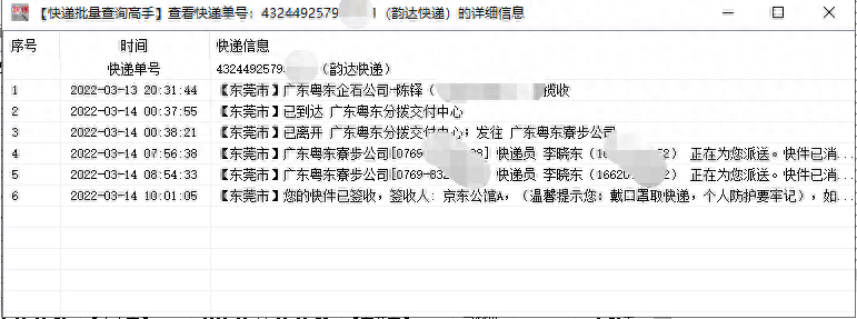 等全部查询完毕,就可以看到每个快递单号的物流情况了,非常方便