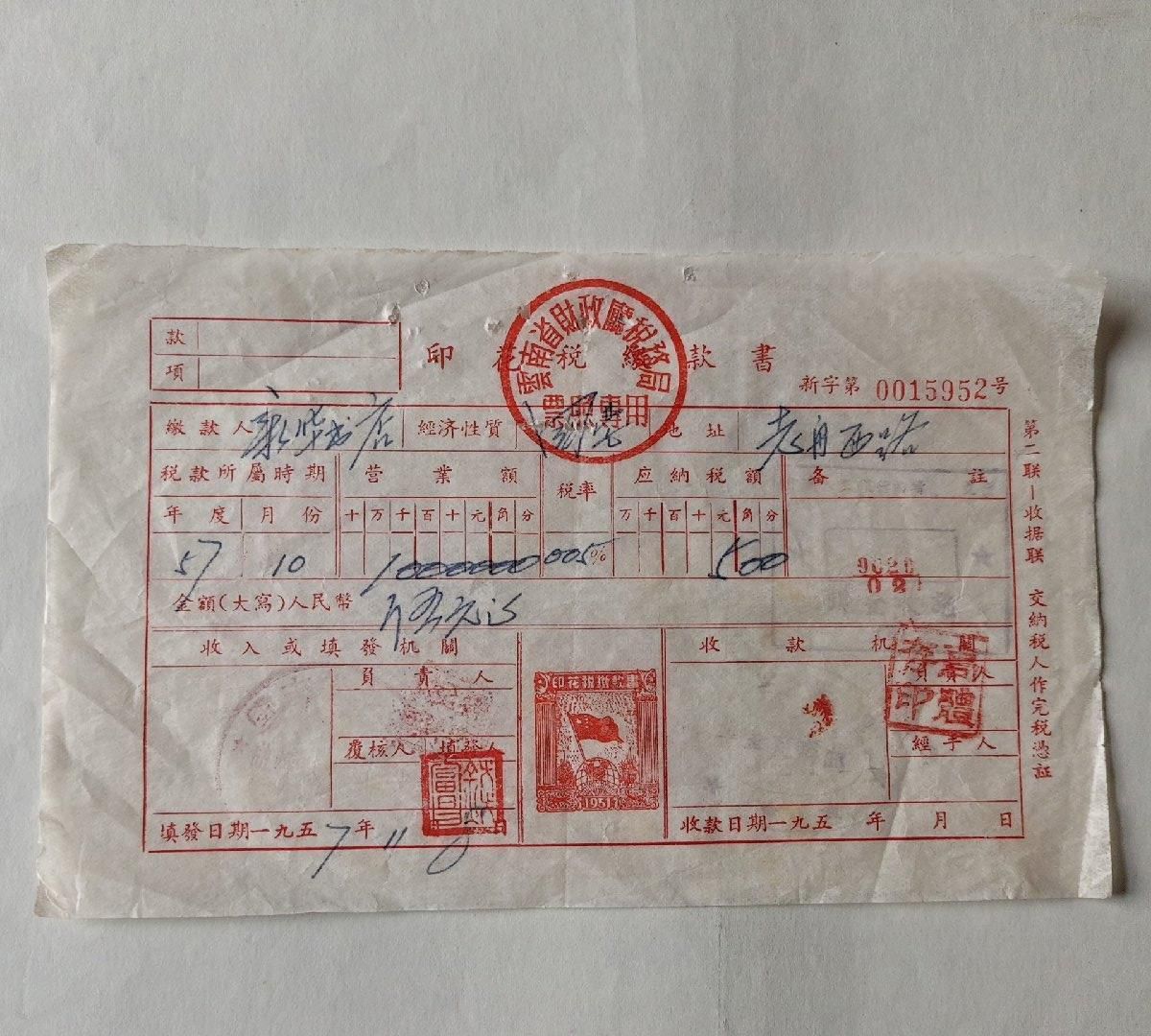 真正的印花税票也不是花的图案,它长得很像之前使用的邮票,白色底红色图案格外醒目。民国时期的印花税最上方从左至右写着“中华民国印花税票”,中间是一搜大帆船,还有飞机、房屋等,左右下角分别写着阿拉伯票值以及大写票值。除此之外,还有印刷税缴款书,上面写着年月,金额,该有好几个红色印章。