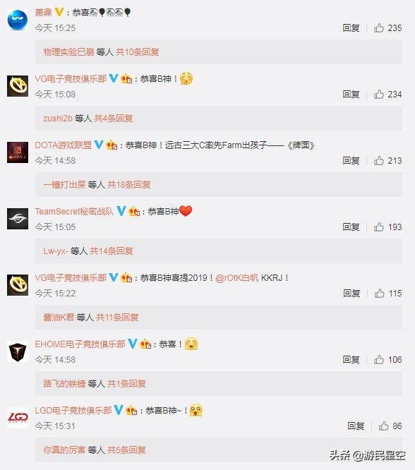 许多《Dota2》电竞俱乐部官微也纷纷在评论区向“B神”传达了祝福之词,其中玄幻小说《诛仙》的作者萧鼎也恭喜了这位新晋奶爸。