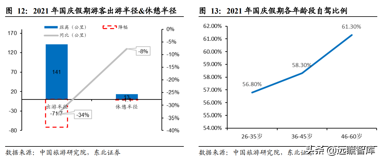 在经历了低迷的暑期市场后,2021年国庆期间全国各地迎来了补偿式出游热潮,根据中国旅游研究院发布的《2021年国庆节假日旅游市场报告》,国庆假期游客出游距离和游憩半径呈现双收缩。游客平均出游半径 141.3公里,同期减少了33.66%。目的地平均游憩半径13.1 公里,同期减少 7.75%。