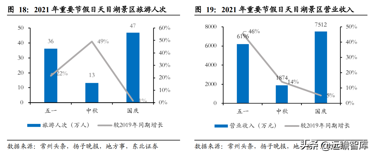 2021年五一、中秋、国庆假期,天目湖景区旅游人次、营业收入较2019年同期均有所增长,民众出游欲望释放。根据携程发布的《2021年中秋假期旅游数据报告》显示,2021年中秋,天目湖为全国黑马周边游景区之一。