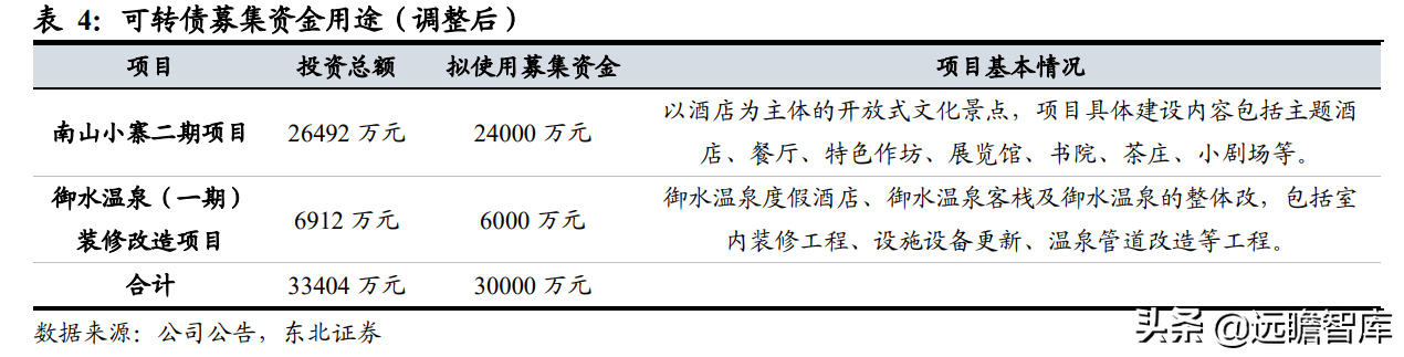 南山小寨二期项目可弥补竹海区域旅游产品的短板,丰富旅游业态和综合配套,推动区域的提档升级;御水温泉(一期)装修改造项目是对2010年开业的温泉区域酒店设施的翻新升级,有助于提升酒店和温泉的品质。