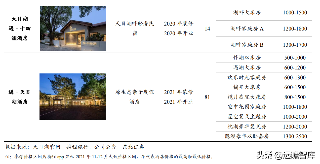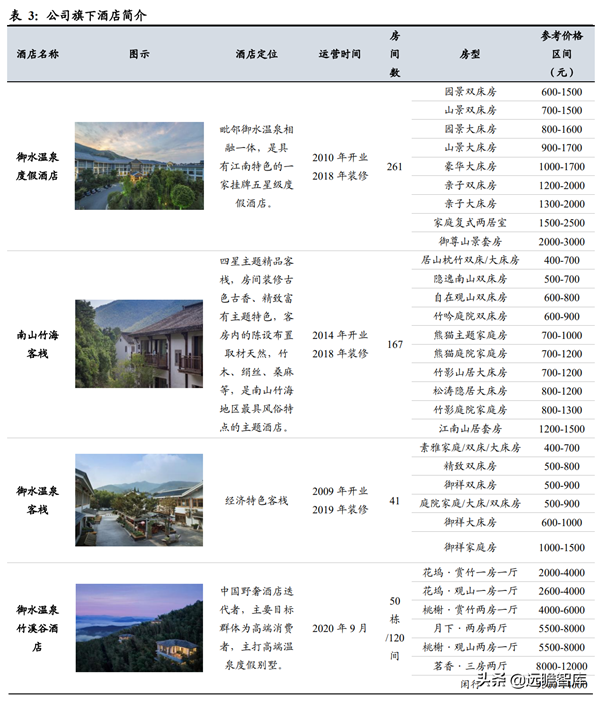 2010年起公司开始运营度假酒店,其旗下酒店包括御水温泉度假酒店、南山竹海客栈、御水温泉客栈及2020年9月新开业的竹溪谷酒店、2021年运营的“遇·十四澜”和“遇·天目湖”酒店。