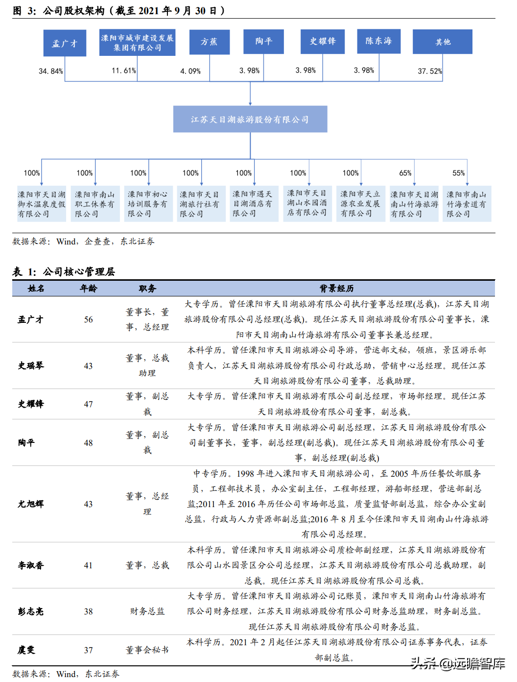 天目湖公司最大股东及董事长、总经理孟广才持股比例34.84%;溧阳市城市建设发展集团有限公司持股比例11.61%,是第二大股东;截至三季报,公司董事方蕉持股比例4.09%,方蕉女士于2020年12月辞去公司董秘等职务,于2021年11月11日公告计划减持其持有股份;其他股东持股比例49.46%。