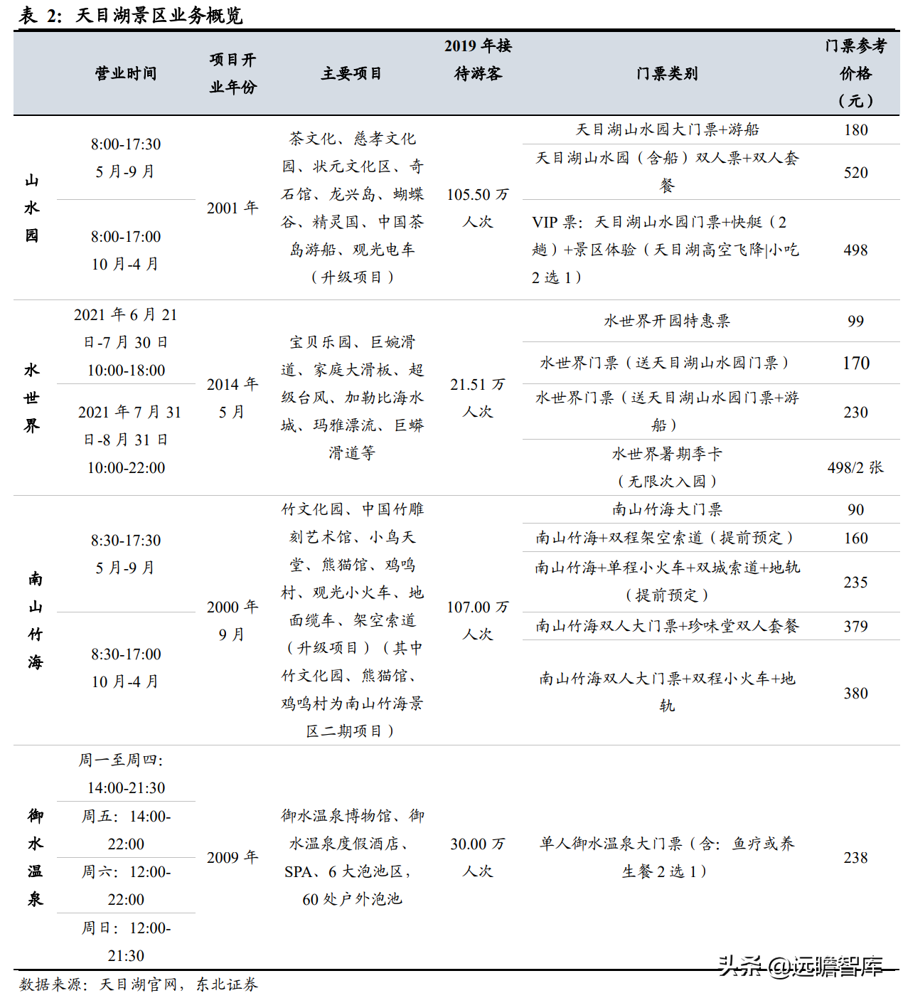 公司在天目湖旅游度假区已经建立以景区和酒店为收入核心的旅游业态,公司共经营三家5A级景区,多家不同定位的酒店民宿,同时拥有旅行社等业务形成全方位互补的旅游产品布局。