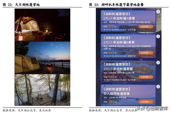 4)帐篷营地:帐篷营地位于天目湖山水园湖畔区域,配备单人帐篷、家庭双人帐篷和家庭大帐篷等多品类帐篷产品,2021年春季公司开展湖畔机车帐篷节,包括夜营、潮玩(机车主题展、创新多功能主题帐篷屋、网红气泡屋、手鼓彩绘、帐篷彩绘、草坪音乐节)两大主题活动,推出四种湖畔帐篷露营地套餐,其形式符合现下流行趋势,吸引更多年轻群体。