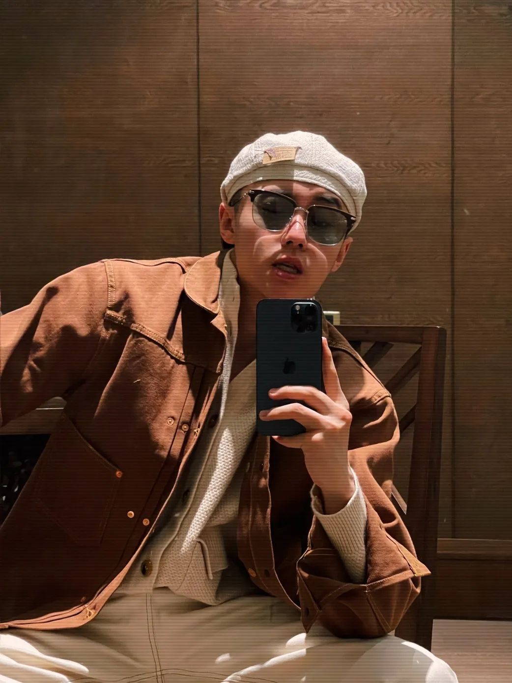 层次感是告别极简后需要划线加粗的搭配要点,翟子路选择了同色系单品的堆叠,针织开衫和针织马甲都是不错的叠穿神器,米色和棕色联手打造年代感复古Look。