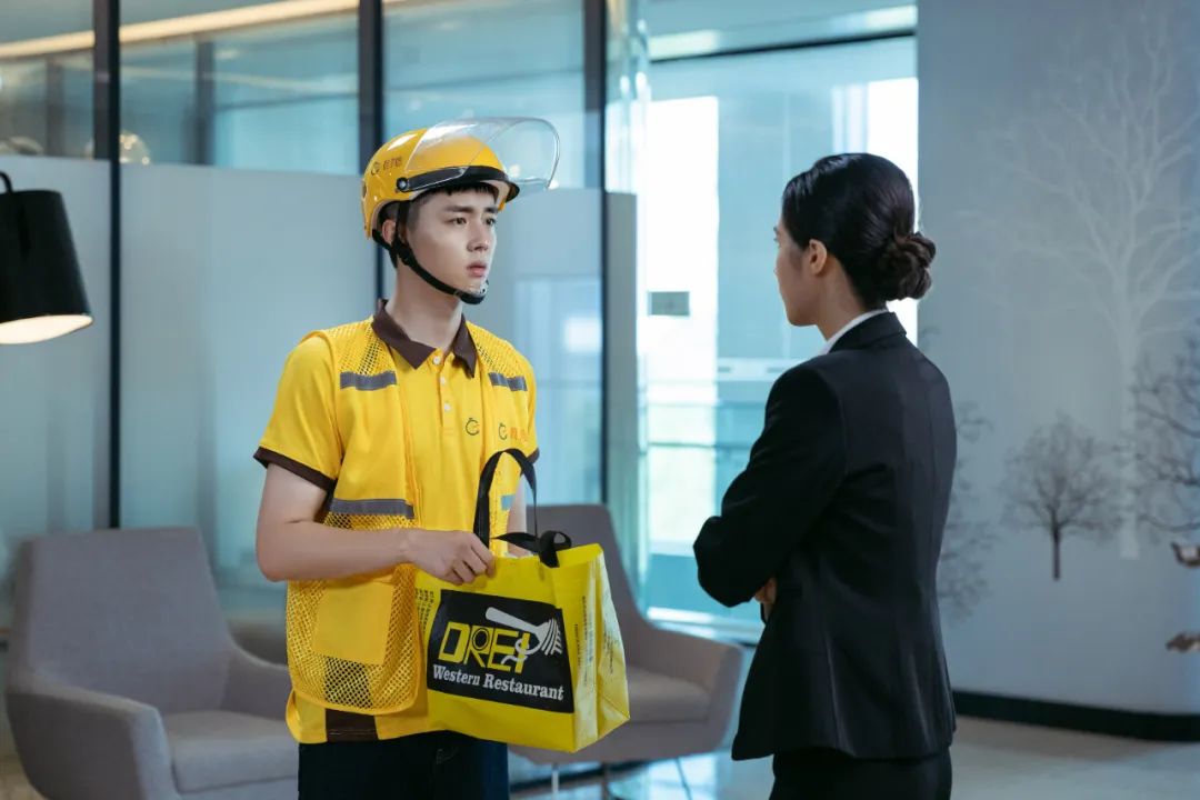 换上明黄色外卖工作服+头盔,也依旧是委屈巴巴的靓仔。