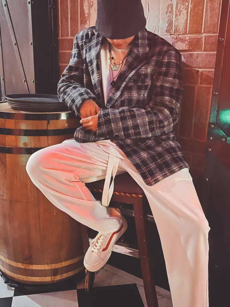 棕色格纹衬衫+运动裤的组合休闲舒适,戴上金属黑框眼镜把文艺值拉满;格纹呢子西装外套跳脱了单品本身的厚重感,在个性项链和休闲T恤的加持下诠释摩登潮流。