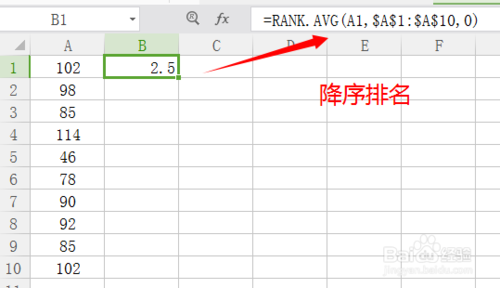 首先,将光标定位到c2单元格。输入rank函数,这里普及下,表格中所有的函数都是以“=”开头的,否则你输入的就是一串字母,显示不出来是函数。输入“=rank”表格会自动显示下拉菜单函数备选。此时我们可以看到弹出RANK函数参数事例。数值表示,你需要进行排名的某一个数字,表格中就是b2单元格的数字,你点击B2单元格,或者直接输入“B2”都是可以的。然后点击逗号,按照事例中显示的格式,开始选择引用区域,引用为数据所在的数组区域,在此选中b列,数据少的话,直接框选B2至b10就行,有些人为了防止选定的区域错乱,都会按shift+f4,给选定区域加上绝对引用,我实践中,觉得必要不大,一般都直接点击下要查看排序的那一列,直接选定整列。目前也没见出过什么错误。