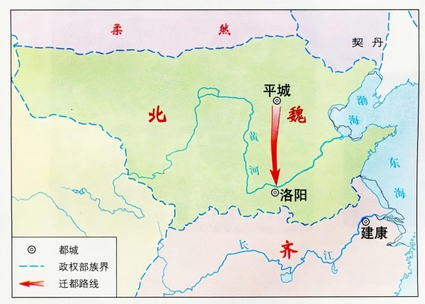 孝文帝亲政后进一步推行改革。494年,孝文帝以南伐为名,迁都洛阳,全面进行汉化改革。改革以鲜卑为首,穿汉服,用汉语,改汉姓,与汉族联姻。皇族拓跋氏改姓元氏,拓跋宏改名元宏。孝文帝改革,大力促进了民族融合与文明进步。