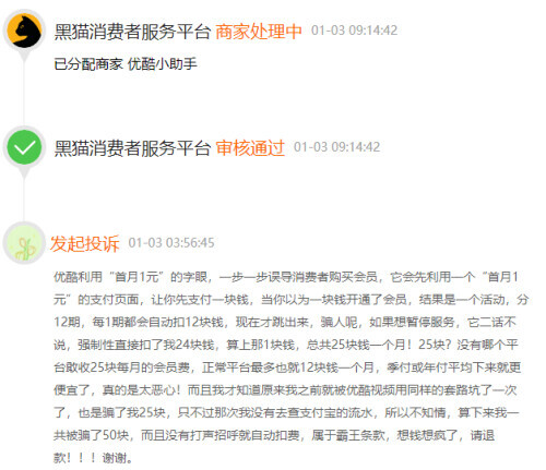 小北介绍道,当下大部分的视频会员均可以随时购买或者退订,即便选择了连续包月选项,也可按照自己的需求在任何时间暂停自动续费。以腾讯视频为例,30天VIP的常规收费为30元,连续包月则可以减少为25元,但在提前中止连续包月计划的情况下,这5元的差价也并不会扣除,“更不用说是在完全不知情的情况下参与了活动,签订了所谓的‘协议’。”小北补充道。而在黑猫投诉平台上,同样认为优酷存在虚假宣传及诱导消费的用户更不在少数:据该平台统计,12月针对优酷“1元会员”的投诉就有近400单。