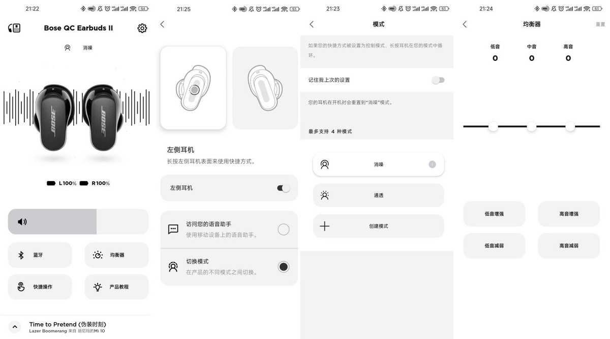 另外,Bose音乐App提供了消噪、通透两个个默认模式以及两个自定义模式,每种模式的降噪等级可以根据使用场景自行设计。耳机支持入耳检测,取下/重新带上耳机时,音频会自动暂停/恢复播放,摘下单只耳机则自动进入通透模式。耳机的综合续航时间有所提升,单次充满使用时间不变,都为6小时,但充电盒的额外充电次数提升到了3次,总续航时间可达到24小时。