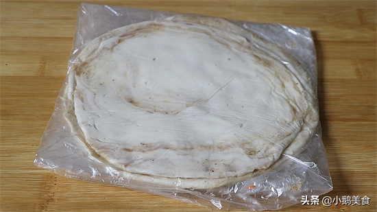 4、饧好后,擀成薄饼,擀好后,用擀面杖挑起来,放到保鲜膜或油纸上,一张一张隔开,最后包起来,冷冻保存半年也不会坏。