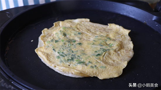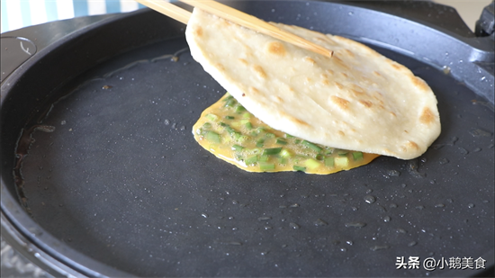 6、爱吃鸡蛋的朋友,可以鸡蛋里加入葱花、盐打散,倒入锅中,再盖上饼子煎至蛋液凝固,就可以了。还可以再煎一根火腿肠,放几片生菜叶,更美味了。
