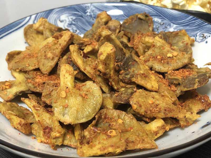 3、等时间到了,把蘑菇倒出来,根据个人的口味,撒入适量的小料,孜然粉、辣椒面都可以,按照这个方式炸的蘑菇,无敌简单又好吃,风味十足,特别适合下酒。