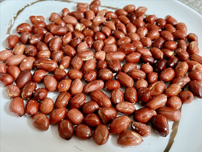 4、取出花生米,倒在盘中晾凉,可以看出来,和油锅炸得一模一样,色泽红亮,口感酥脆,撒一些食盐,拌匀即可开吃。