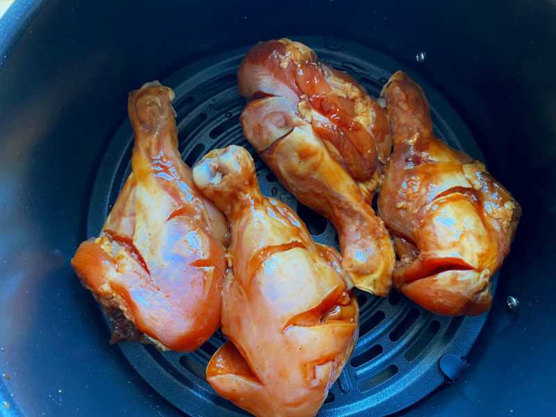 2、底下铺一层锡纸或油纸,放入鸡腿,温度设定为180度,时间为13分钟,等时间到了,涂抹一层蜂蜜水,温度不变,继续炸12分钟,大功告成。