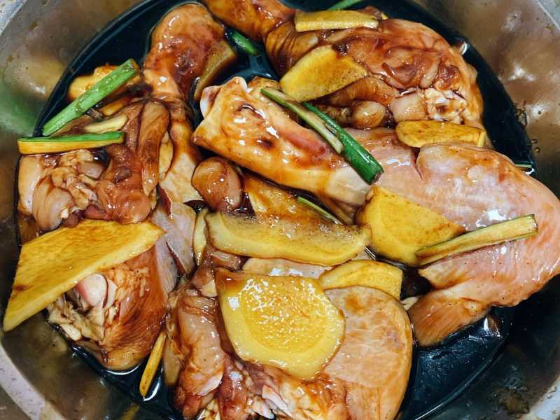 1、准备七八个琵琶腿,清洗干净,用刀划出几个口子,方便入味,放入葱姜,生抽、老抽、蚝油、食盐、蜂蜜、料酒,涂抹均匀,腌制一个晚上入味。
