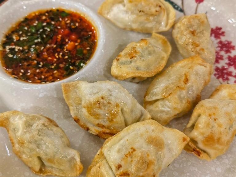 3、简单调一个料汁,碗中加入生抽、陈醋、辣椒油、白芝麻、小米椒,翻拌均匀,煎饺子就可以吃了,色泽金黄,表皮酥脆,大人孩子都爱吃。