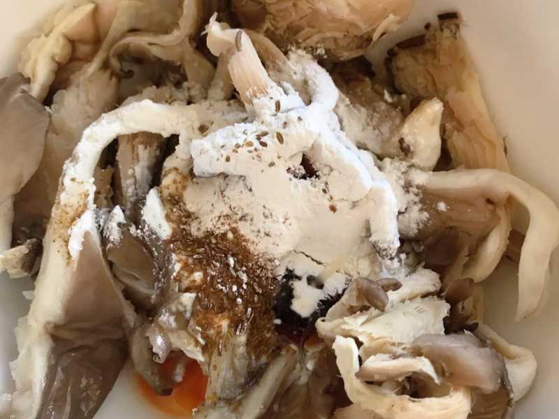 1、准备适量的平菇,摘成小朵,用淡盐水浸泡一会儿,冲洗干净,攥干多余的水分,再加入孜然粉、鸡蛋、蚝油,适量的淀粉和面粉,翻拌均匀。