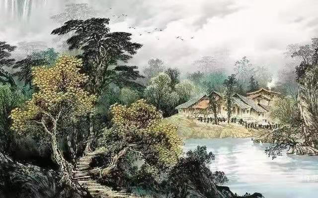 而“合”字和“斜”这两个动词,将绿树、村落、青山这三者完美地融合在一起,极富画面感,一种清新自然,恬淡宁静的气息扑面而来,令人陶醉。