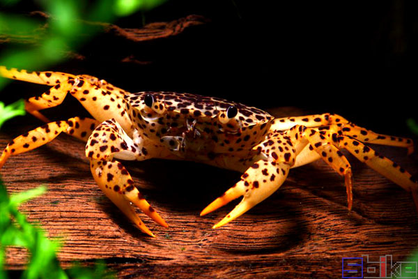 豹点蟹:是少数可以深水饲养的河蟹品种之一,基色金黄,浑身布满深褐色至咖啡色豹斑,非常漂亮,观赏价值极高。