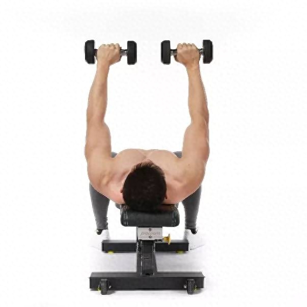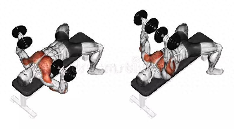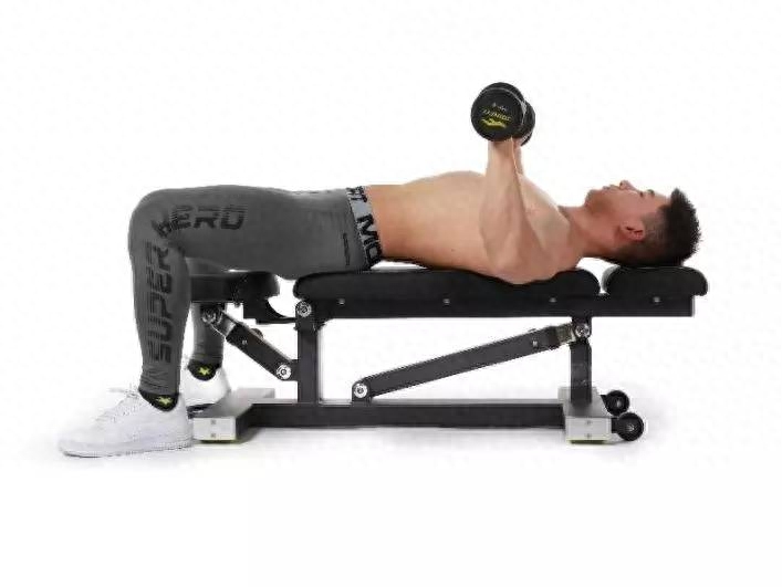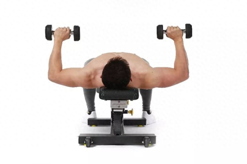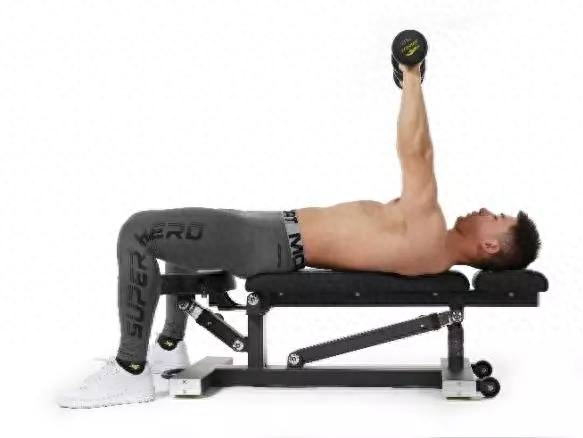 动作准备:双脚踩实地面仰卧训练凳上,臀部上背部头部贴紧训练凳,核心绷紧,哑铃在肩正上方,正握闭握,手腕中立位,手臂伸直不锁死。