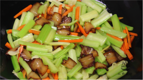10、这里我们不用再额外加盐了,因为腊肉和芹菜中已经有少许的盐分,再次给它翻炒片刻后,将其炒到熟透,即可出锅装盘,进行享用了。