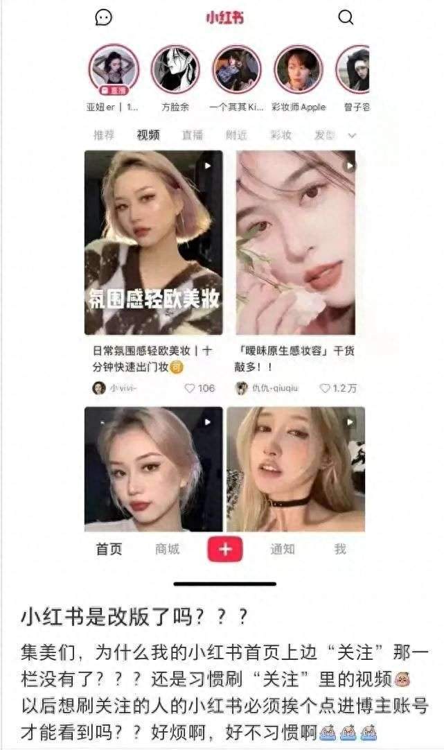 就在10月,小红书有一个灰度更新,是取消“关注页”。在这一版本,被关注的博主只会在页面上端横条得到少量展示,失去了原本的单独信息流。