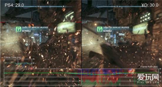 我们再看另一组对比,这次我们依次导入PS版与XO版的《蝙蝠侠阿卡姆骑士》,与《命运》不同,《阿卡姆骑士》对主机的机能要求更高,所以我们在两个平台上都找到了掉帧与画面撕裂。