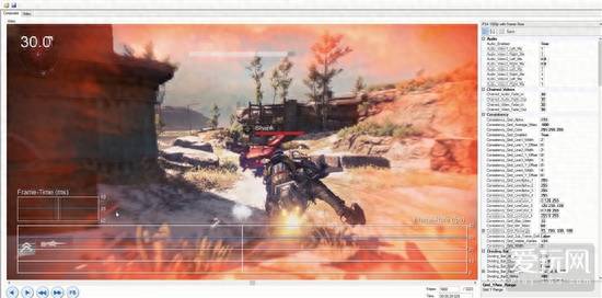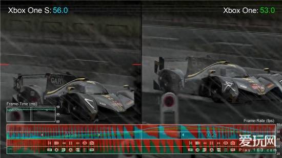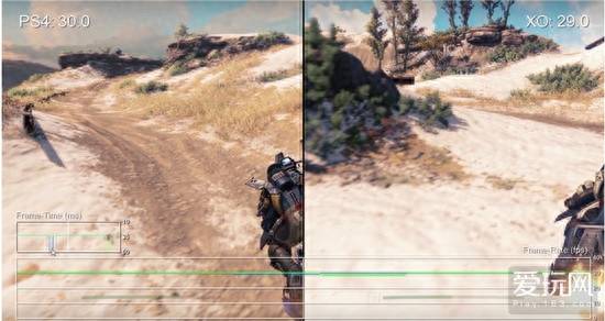 然后我们再来看看喜闻乐见的跨平台对比,我们分别导入两个平台的重复片段视频,并设置成分屏显示,在图中我们可以清楚地看到左边为PS4的帧率情况,右边为XBOX的帧率情况,而图表中不同颜色的线则代表不同平台。